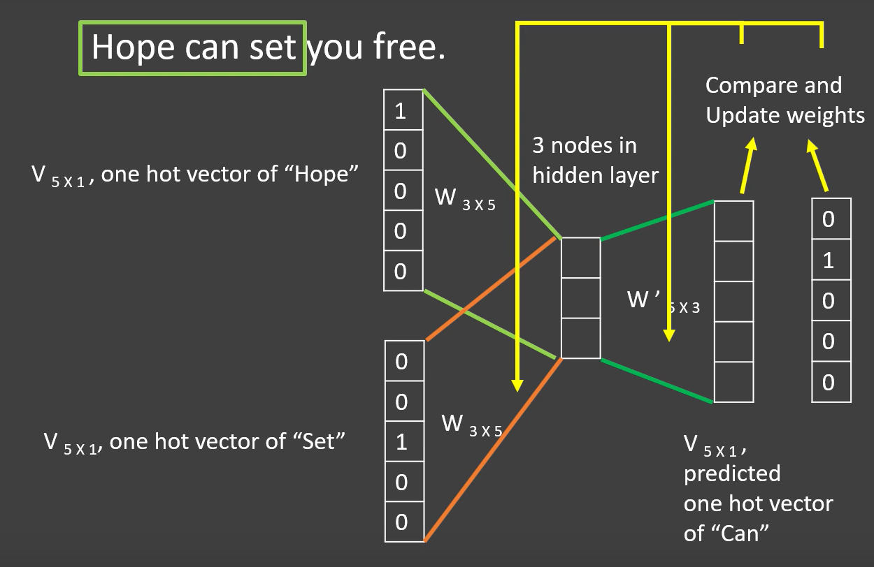 Now fix a window size as 3 and predict the vector of the center word from the hot vectors of other two words as shown in the figure 1.