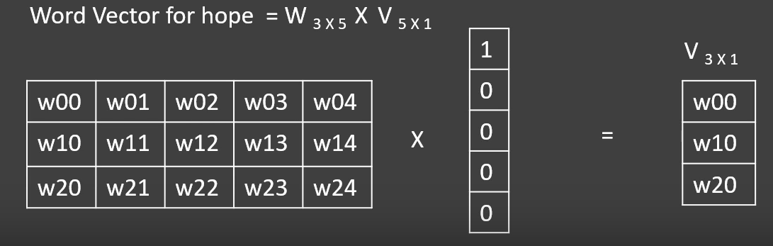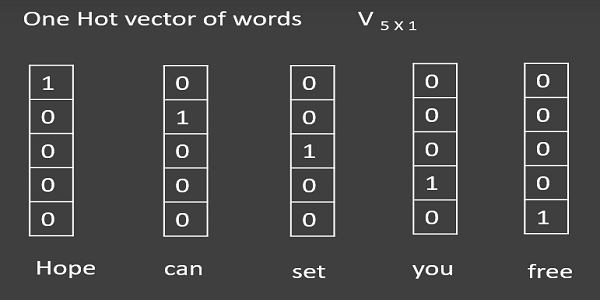 Example: English dictionary has billions of words which is difficult to form an example. So, let us consider a language having only the words hope, can, set, you, free. Also assume that I have a corpus containing hope can set you free. Now break the sentence into atomic words and remove stop words(is, are, and etc..,). As there are no stop words in this sentence no need to worry about that. Generate hot vectors for these words in the corpus corresponding to the words in english language as shown in the figure 0.