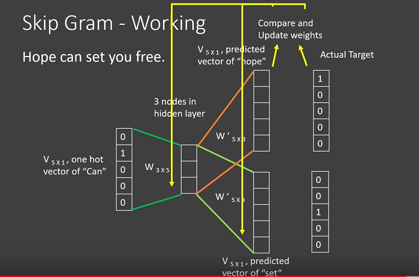 - After generating the hot vectors of the words and fixing the window size as 3 as shown in the figure 0 and figure 1 respectively, we predict the vectors of the words “hope” and “set” using the vector of “can” as shown in the figure 4