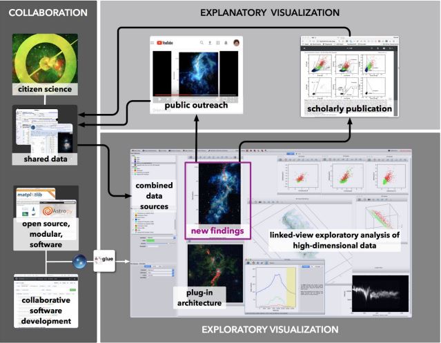 Because of its strong base in Python, it becomes an intermediate layer between explainers and the explorers, particularly in the field of astronomy.[4] It also provides us separate plugins for Medical Imaging, Geosciences, and Astronomy. It works on exploiting the logical links that exist in different datasets. The figure below is a pictorial representation to show a high-level visuals provided by Glue for the astronomical data. [5]